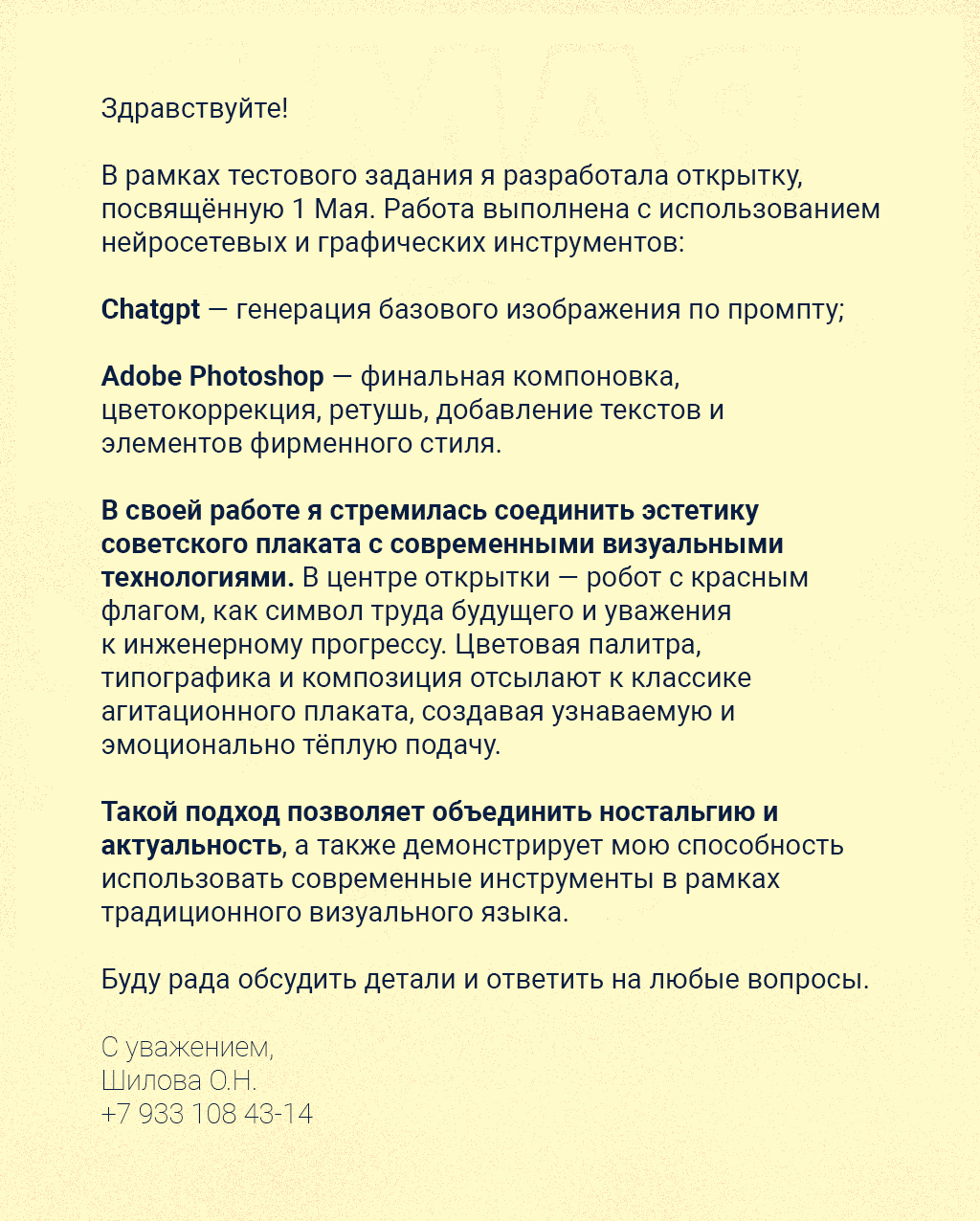 В этой работе я не просто рисовала, а сотрудничала с ИИ: мы вместе закрутили идею, я добавила стиль и детали — и вуаля! Получилась открытка с характером и нейросетевым вайбом. В портфолио — срочно и с огоньком! 🤖🌸✨